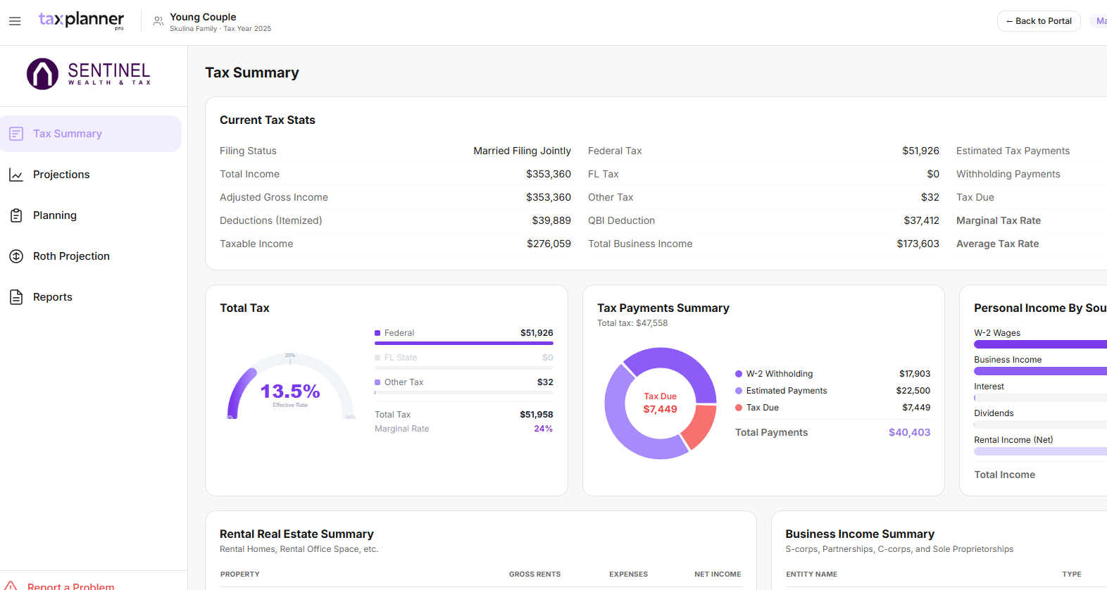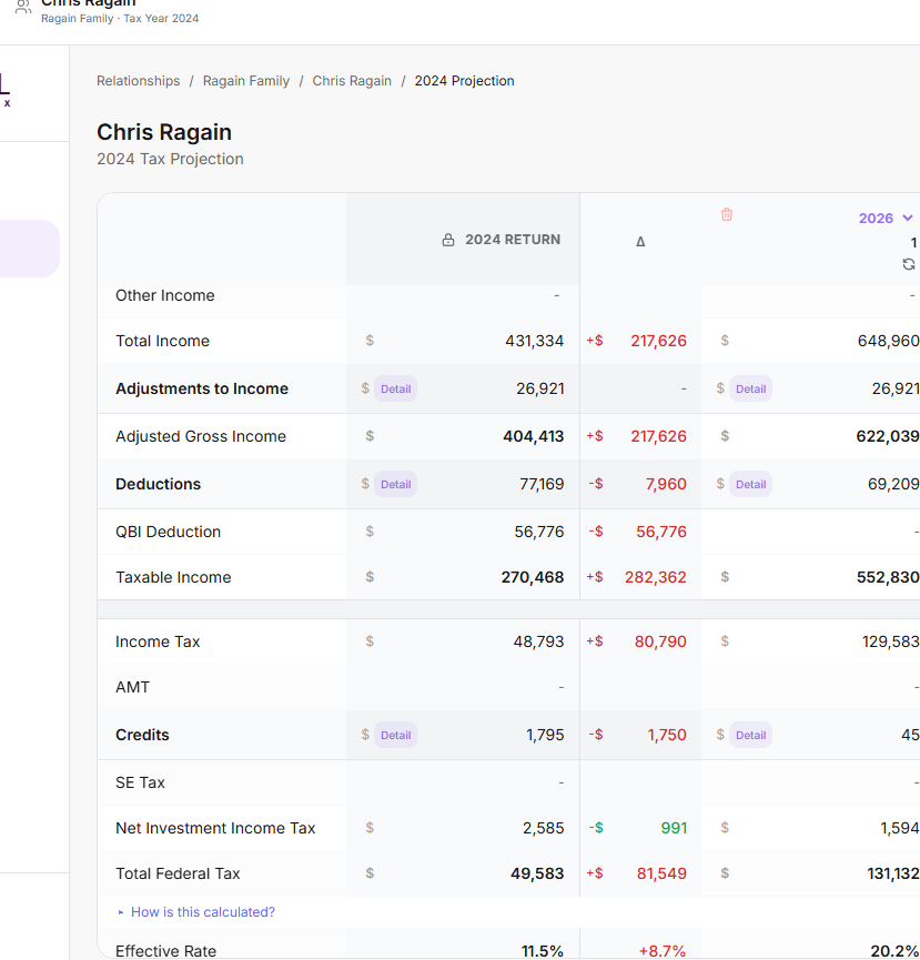 Whether your client is W-2, business owner, or both, Tax Planner Pro organizes the inputs the way you think about them—income, expenses, and ownership—then translates that into projected taxable income and expected tax outcomes.